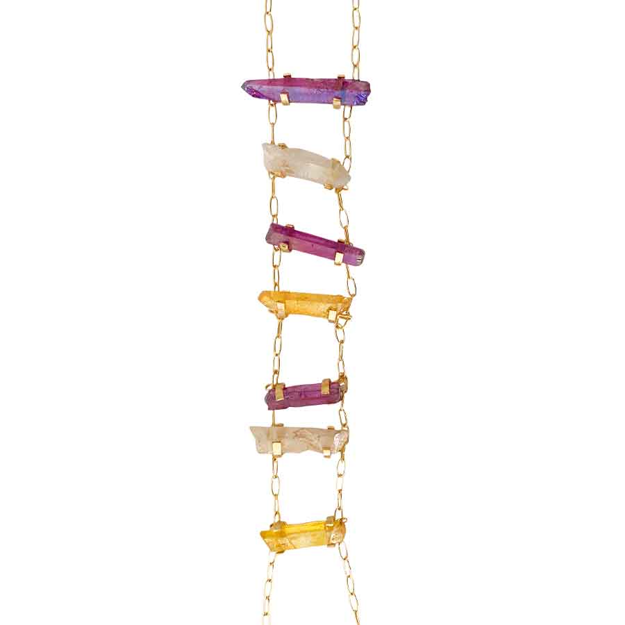 Elaborado artesanalmente en bronce con baño en oro de 24k, este body chain está compuesto por una secuencia de cuarzos naturales en tonos blancos, rosados y ámbar, cuidadosamente dispuestos para crear un equilibrio armónico y luminoso. Cada cristal simboliza claridad, sanación y transformación, convirtiendo la pieza en un amuleto contemporáneo de belleza y poder.