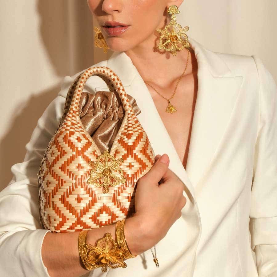 Brazalete elaborado a mano en hilos de bronce con baño de oro de 24k, usando la técnica de la filigrana.