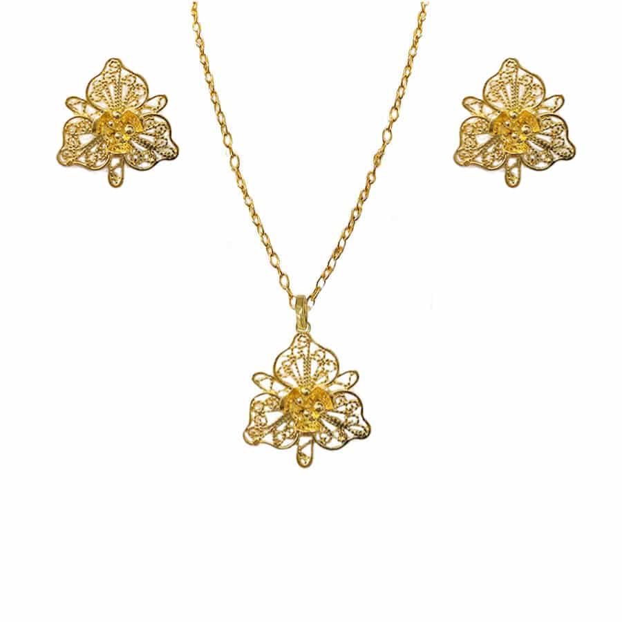 Ua set elegante y lleno de significado. Aretes y Cadena bañada en oro de 24k con un dije en forma de orquídea, elaborado en filigrana completamente. Perfecta para quienes aman la elegancia sutil y el arte hecho a mano.