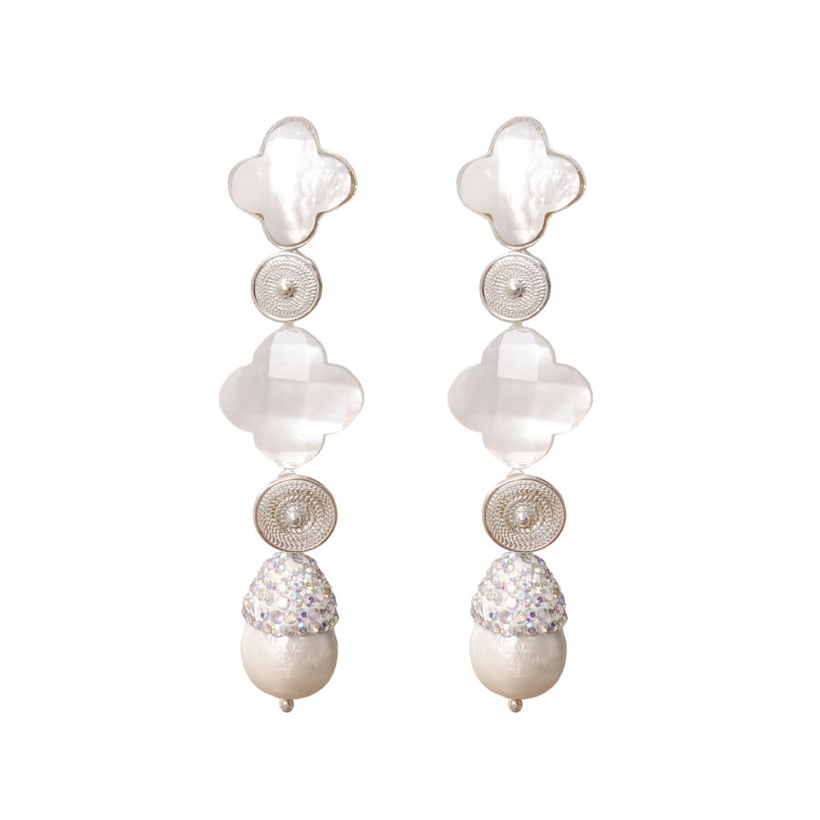 Aretes largos elaborados en filigrana colombiana, madreperla. Un diseño luminoso que mezcla texturas artesanales y brillo sutil, perfecto para elevar cualquier look.