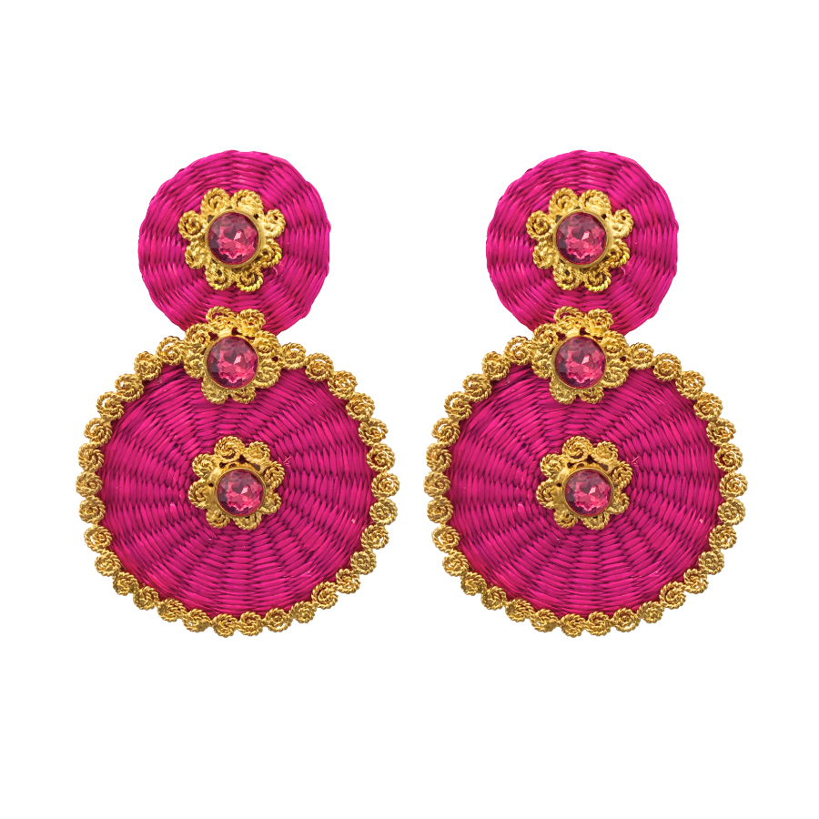 Aretes elaborados a mano tejidos en palma de iraca. en el centro y al rededor del segundo cierculo, rollitos en hilos de bronce usando la técnica de la filigrana, con baño de oro de 24k y cristales en color fucsia.