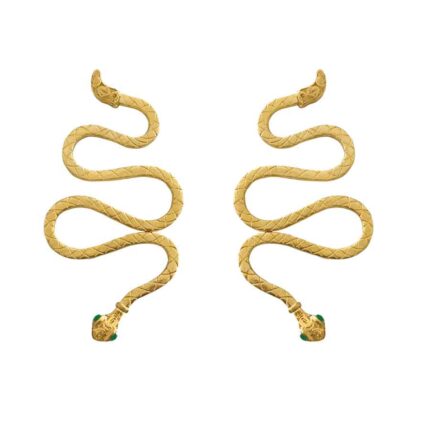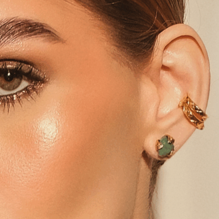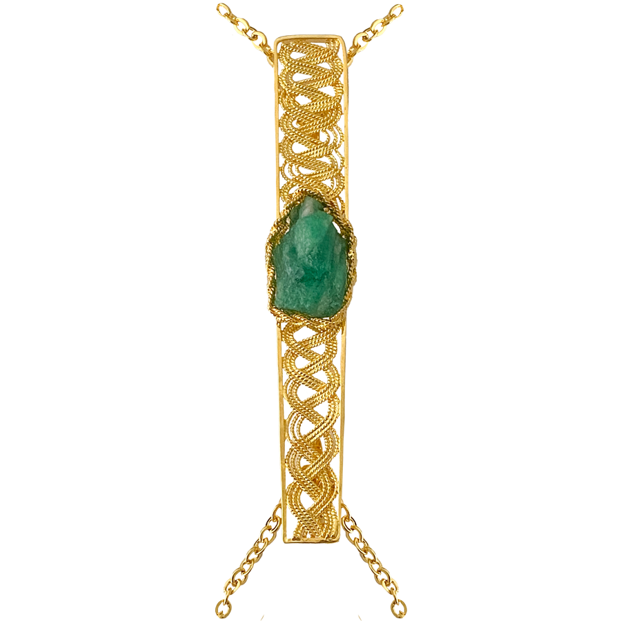 Body chain elaborado en bronce con baño en oro de 24k. La pieza central está compuesta por una trenza creada con la técnica de filigrana, acompañada por una esmeralda natural en bruto como protagonista. Su diseño lineal, unido por finas cadenas, enmarca el torso y aporta un toque de elegancia contemporánea. Ligero, cómodo y ajustable, es el complemento perfecto para elevar cualquier look con el sello de lujo artesanal colombiano.