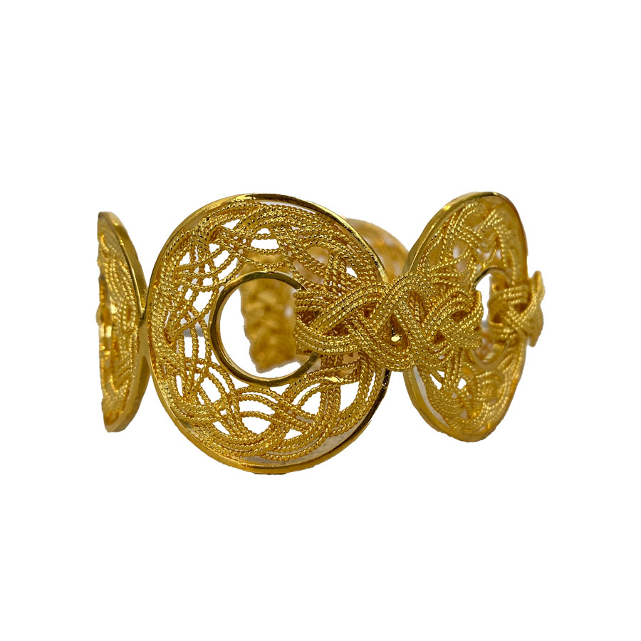 Brazalete hecho a mano en Colombia con la técnica ancestral de filigrana, esta pulsera está hecha en bronce y rematada en oro de 24k. Sus intrincados patrones tejidos capturan la luz con cada movimiento, reflejando el arte y la tradición detrás de cada creación.