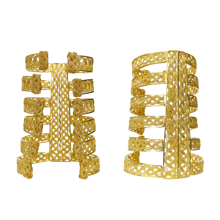 Brazalete con trenzas hecha a mano en hilos de bronce mediante la técnica de filigrana, con baño en oro de 24k, con un toque de glamour y elegancia.