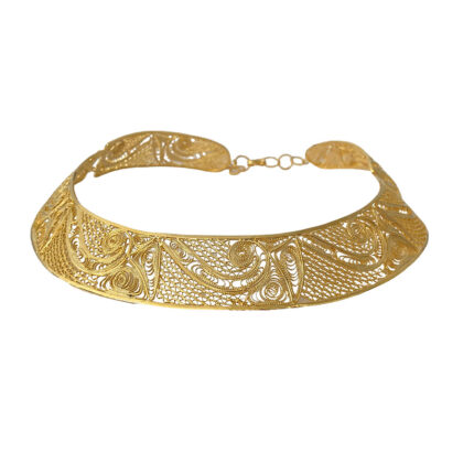 Collar tipo gargantilla, elaborado a mano en hilos de bronce usando la técnica de la filigrana, con baño de oro de 24k y esmeraldas colombianas en bruto. Atrás viene con cadena que permite ser ajustable.
