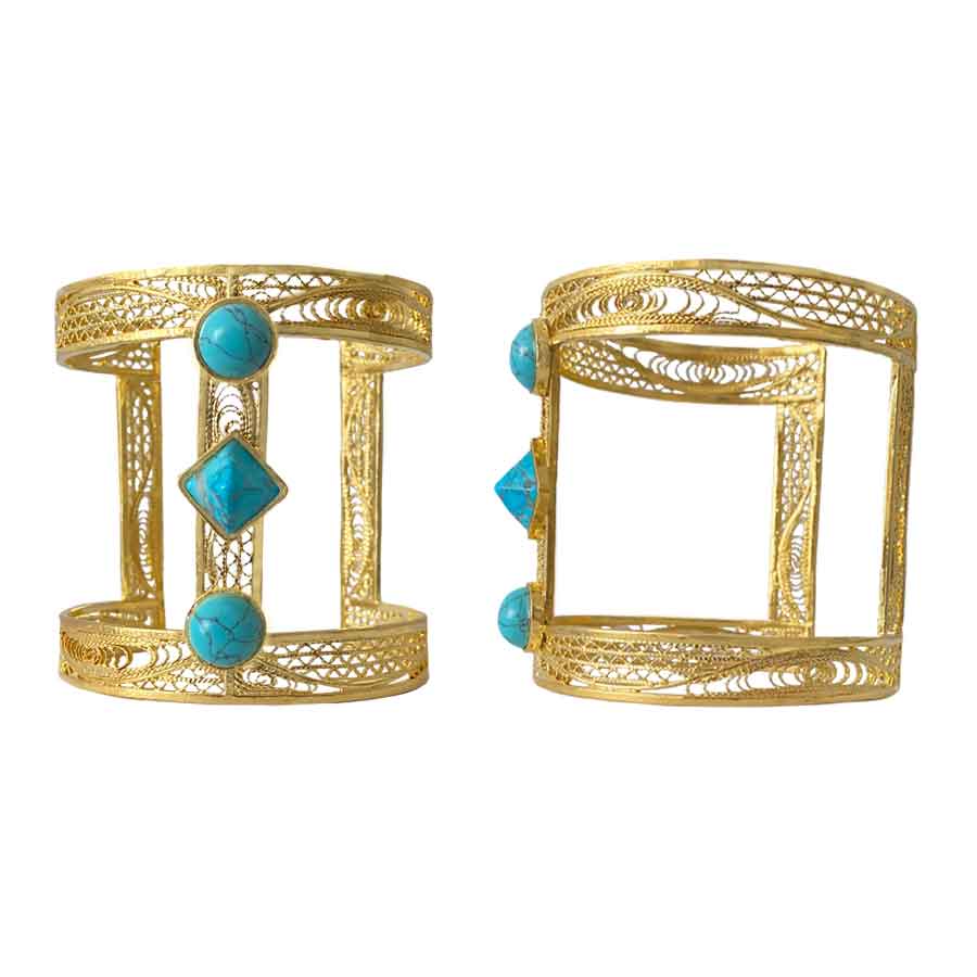Elaborado artesanalmente en bronce con baño en oro de 24k, este brazalete destaca por sus delicados calados y detalles orgánicos, reflejo de un oficio joyero meticuloso. Tres turquesas naturales —dos circulares y una central en forma romboidal— aportan equilibrio, color y simbolismo, representando protección, armonía y conexión espiritual.