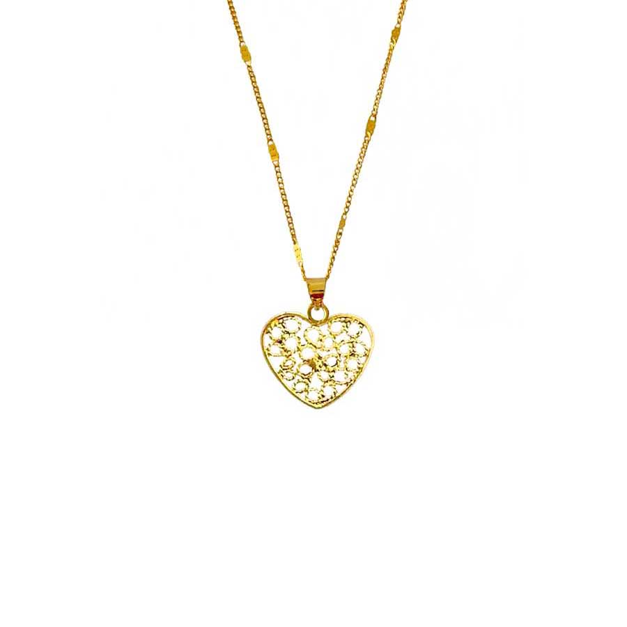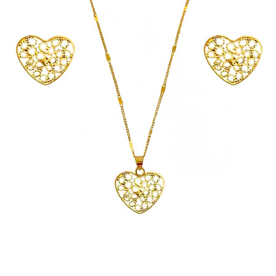 Una pieza minimalista y llena de significado, con delicados aretes en forma de corazón están minuciosamente elaborados en filigrana, una técnica ancestral que teje hilos de bronce con maestría y una cadena bañada en oro de 24k con un dije en forma de corazón. Perfecta para quienes aman la elegancia sutil y el arte hecho a mano.