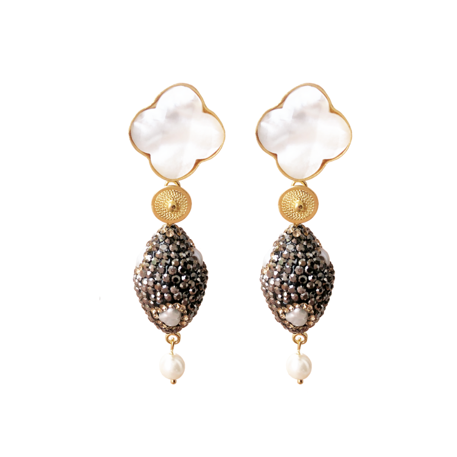 Aretes en filigrana colombiana con madreperla tallada y lágrimas perladas enmarcadas en destellos iridiscentes. Un diseño luminoso y delicado que realza cualquier ocasión.