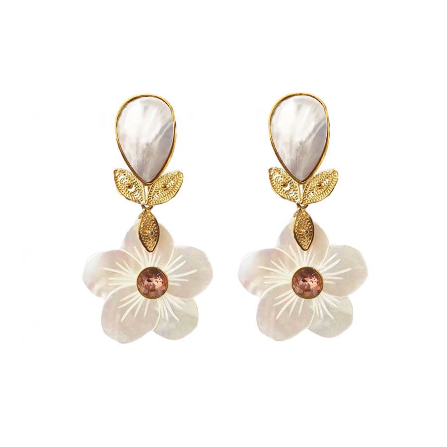 Aretes elaborados a mano en hilos de bronce usando la técnica de la filigrana, con baño de oro de 24k. Hermosas flores talladas en madre perla.