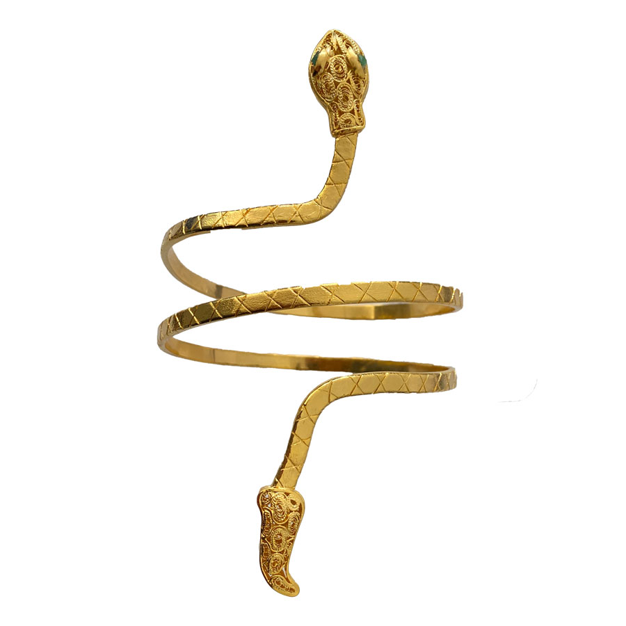 Brazalete elaborado a mano en hilos de bronce con baño de oro de 24k, detalles en filigrana en la cabeza y cola de la serpiente y esmeraldas colombianas en bruto en los ojos.