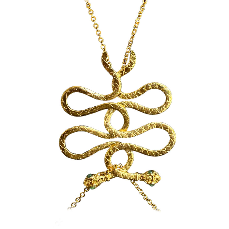 Body Chain elaborado a mano en hilos de bronce con baño de oro de 24k. Detalles en filigrana en la cabeza de la serpiente y esmeraldas colombianas en bruto en los ojos.